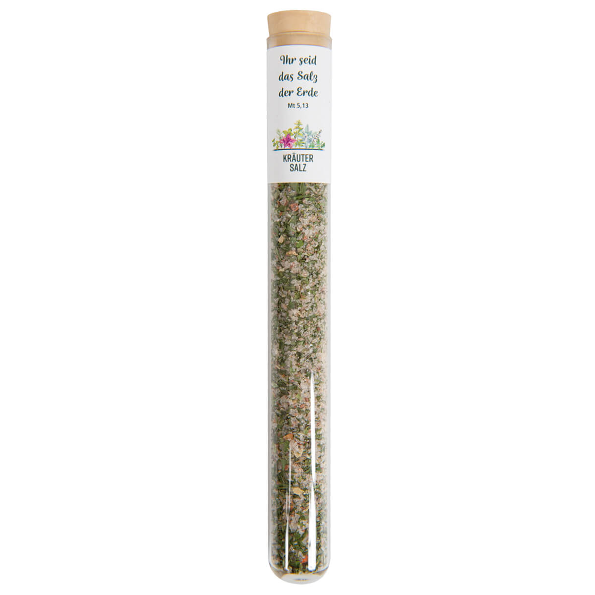 Gewürzmischung Kräutersalz im Glasröhrchen mit Text: Ihr seid das Salz der Erde
