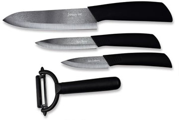Hochwertiges 4-teiliges Set, bestehend aus drei scharfen Keramikmessern mit Klingenschutz in unterschiedlichen Klingenlängen (7,5 cm, 10 cm, 14,5 cm). Die Messer sind unterschiedlich graviert mit "Jesus ist", "das Brot" und "des Lebens". Zum Set gehört zusätzlich noch ein Gemüseschäler.