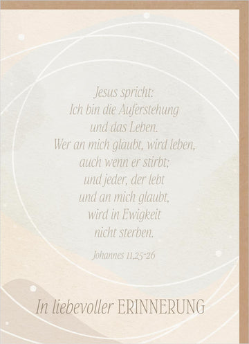 Ich bin die Auferstehung und das Leben. Wer an mich glaubt, wird leben, auch wenn er stirbt; und jeder, der lebt und an mich glaubt, wird in Ewigkeit nicht sterben.