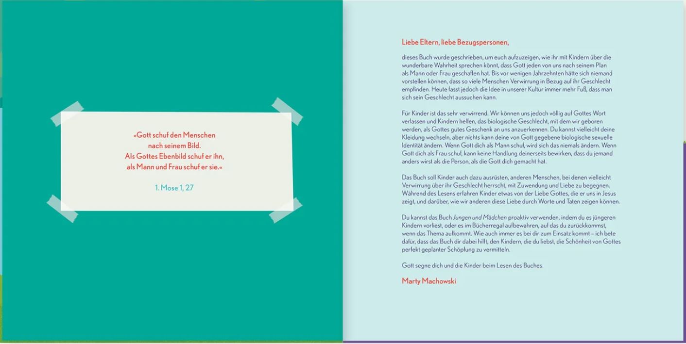 Fussball oder Tanzen? Kochen oder Bauen? Das sind Interessen, die ein Kind haben kann, die aber weder von seinem Geschlecht bestimmt werden noch sein Geschlecht definieren. Ausgehend von einer Alltagssituation erklärt Marty Machowski in diesem Buch einfühlsam und leicht verständlich, dass das Geschlecht eines jeden Kindes ein gutes, unveränderliches Geschenk Gottes ist. Dann zeigt er anhand des Evangeliums, wie Gott sich die Welt ursprünglich gedacht hat und wie sie wurde, wie sie heute ist.