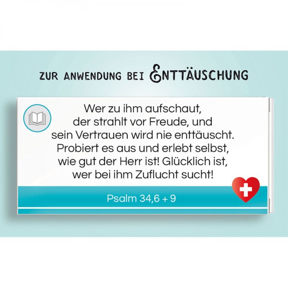 Nicht immer ist alles im Lot. Mal ist man erschöpft, mal mutlos, mal traurig ... Gut, wenn man dann diesen kleinen "Notfall-Koffer" zur Hand hat. Er hält hilfreiche biblische Mutmacher für herausfordernde Gefühlslagen bereit. Wie eine kleine Hausapotheke präsentieren 62 Kärtchen im Medikamentenschachtel-Design Bibelworte, die tröstend und erfrischend in die Situation sprechen.