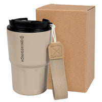 Stylischer Thermobecher für unterwegs aus doppelwandigem Edelstahl, in der modernen Farbe sand mit seitlicher, abnehmbarer Trageschlaufe in dazu passender Farbe.