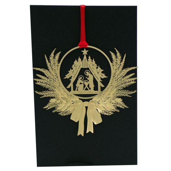 Schöner Baumschmuckanhänger aus glänzendem goldfarbenem Metall an einem edlen Satinband.