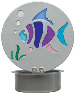 Rundes Leuchtornament mit buntem Fisch-Motiv. Durchmesser: 6 cm Lieferung mit Teelicht.