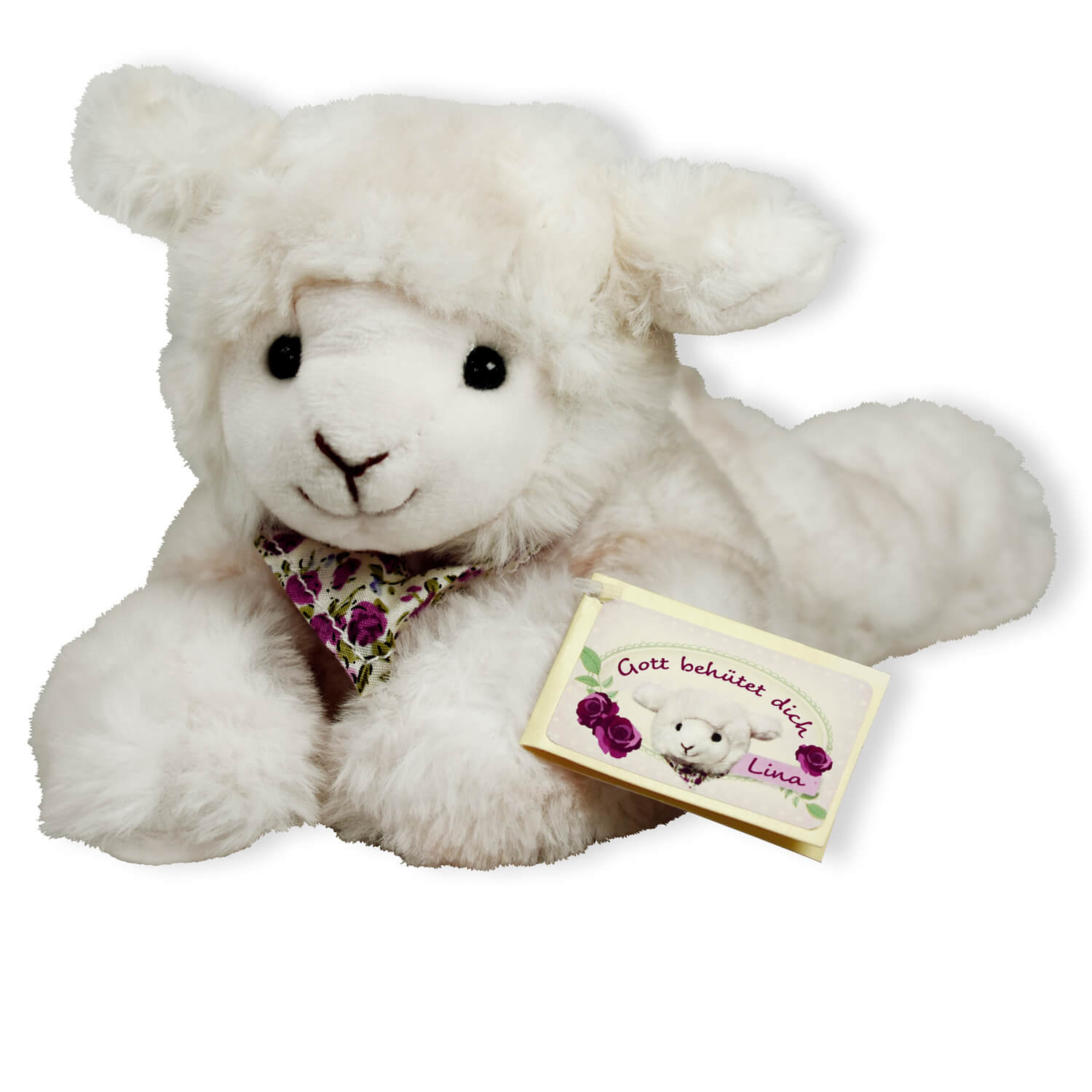 Liegendes Schäfchen "Lina" aus flauschig weichem Plüsch (100 % Polyester) mit buntem Halstuch.