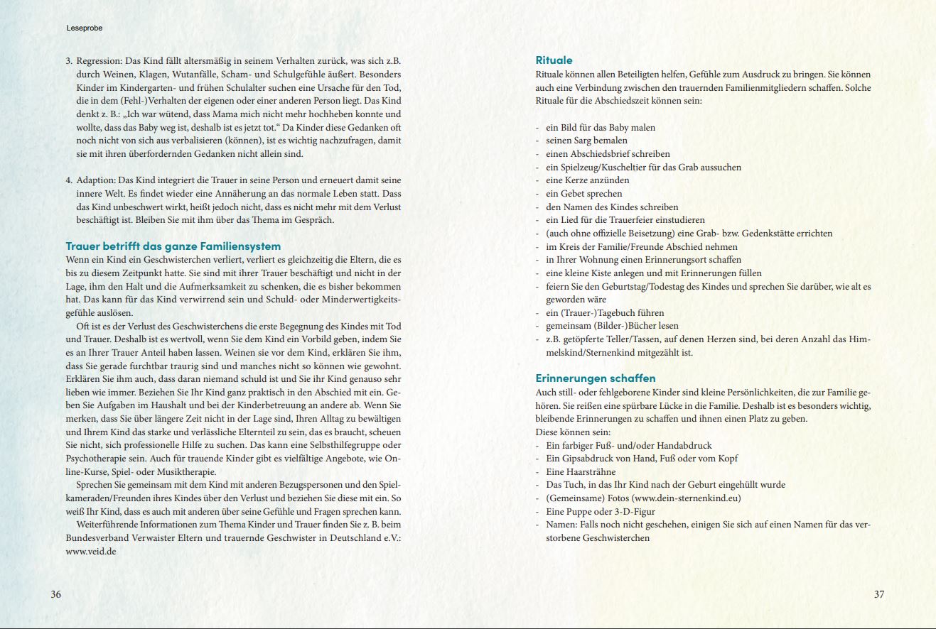 Dieses liebevoll illustrierte und einfühlsam erzählte Kinderbuch möchte Kinder im Vor- und Grundschulalter (ab 3 Jahren) und ihre Familien begleiten, die in einem späten Schwangerschaftsstadium ein Geschwisterkind verloren haben. Im Anschluss an die Geschichte gibt es einen Sachteil und weiterführende Links für Eltern und Angehörige zum Thema Sternenkinder und Stille Geburt.