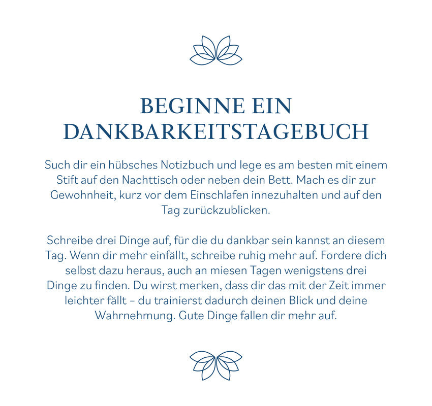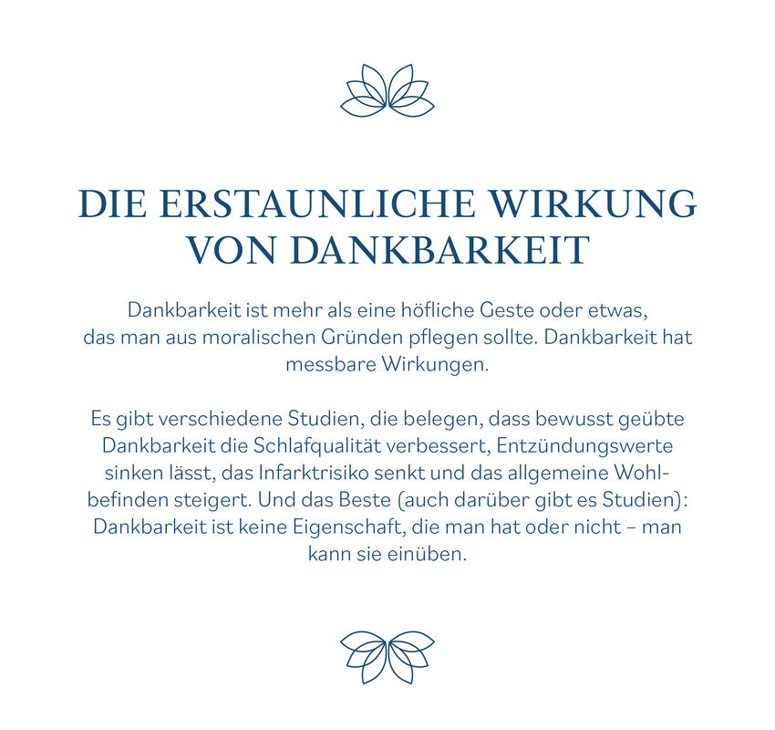Das Aufstellbuch rückt die Dankbarkeit auf sehr dekorative und unaufdringliche Weise in den Blickpunkt. Neben den inspirierenden Bildseiten bietet es für jede Woche des Jahres einen Impuls und eine Frage zum Weiterdenken, die dafür sorgen, dass die Dankbarkeit ganz unauffällig immer selbstverständlicher wird und ganz nebenbei mehr Freude in den Alltag einzieht.