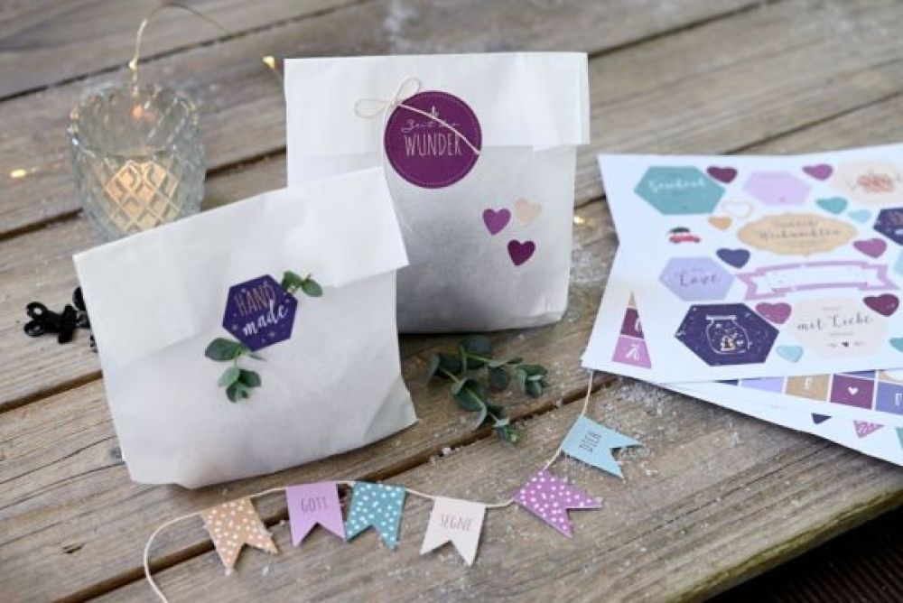 Enthalten sind 246 Etiketten & Schmuckaufkleber, 354 Buchstaben, 30 Zeichen, 96 Herzen und 126 Wimpel.