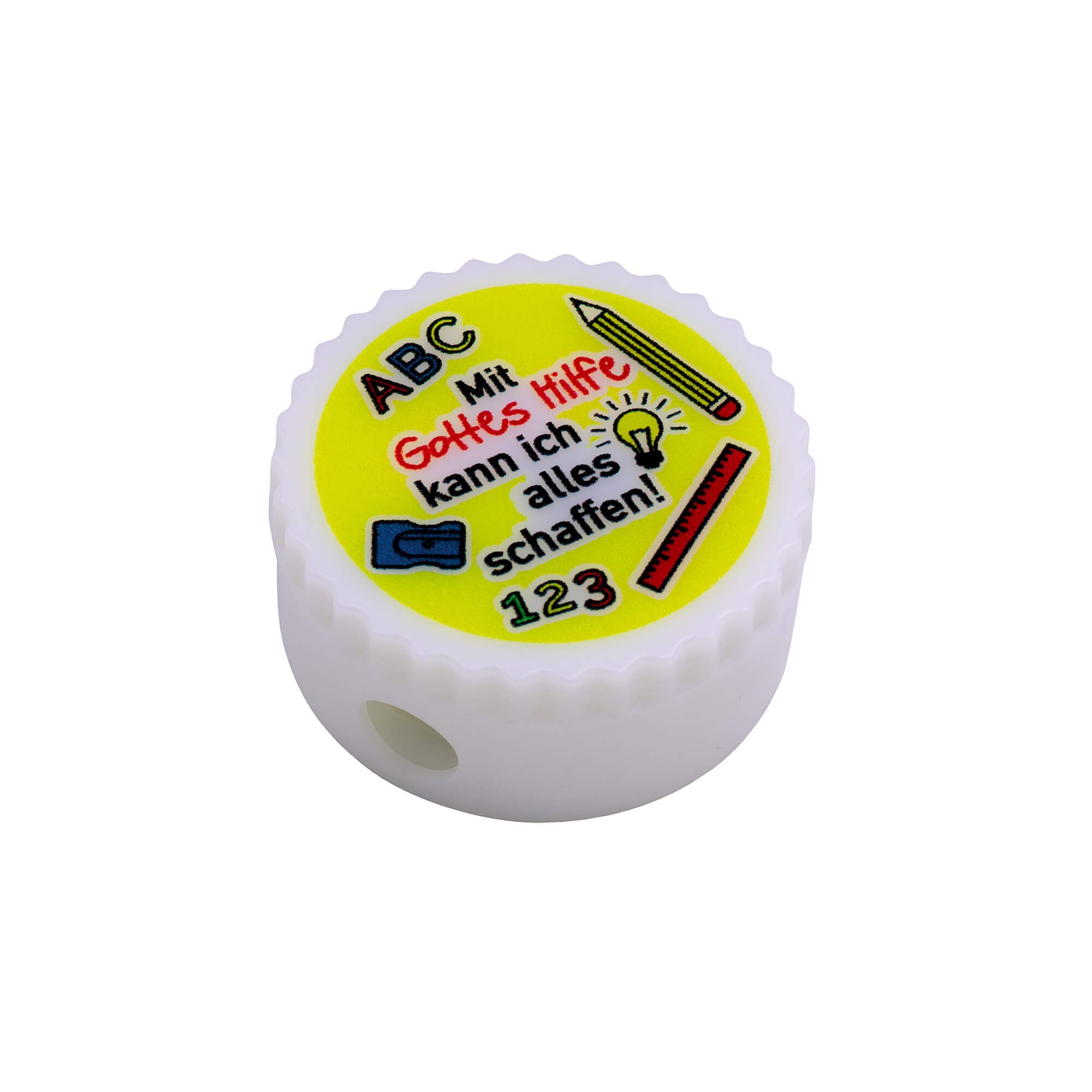 Handlicher Anspitzer mit mutmachendem Aufdruck "Mit Gottes Hilfe kann ich alles schaffen!".