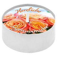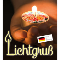 Ein kleiner Lichtgruß mit einer passenden Faltkarte (Format 9 x 9 cm). Das Teelicht ist auf besondere Weise veredelt. Beim Abbrennen schwimmt die Botschaft auf dem flüssigen Wachs und bleibt so - bis auf ein kleines Loch um die Flamme herum - sichtbar.