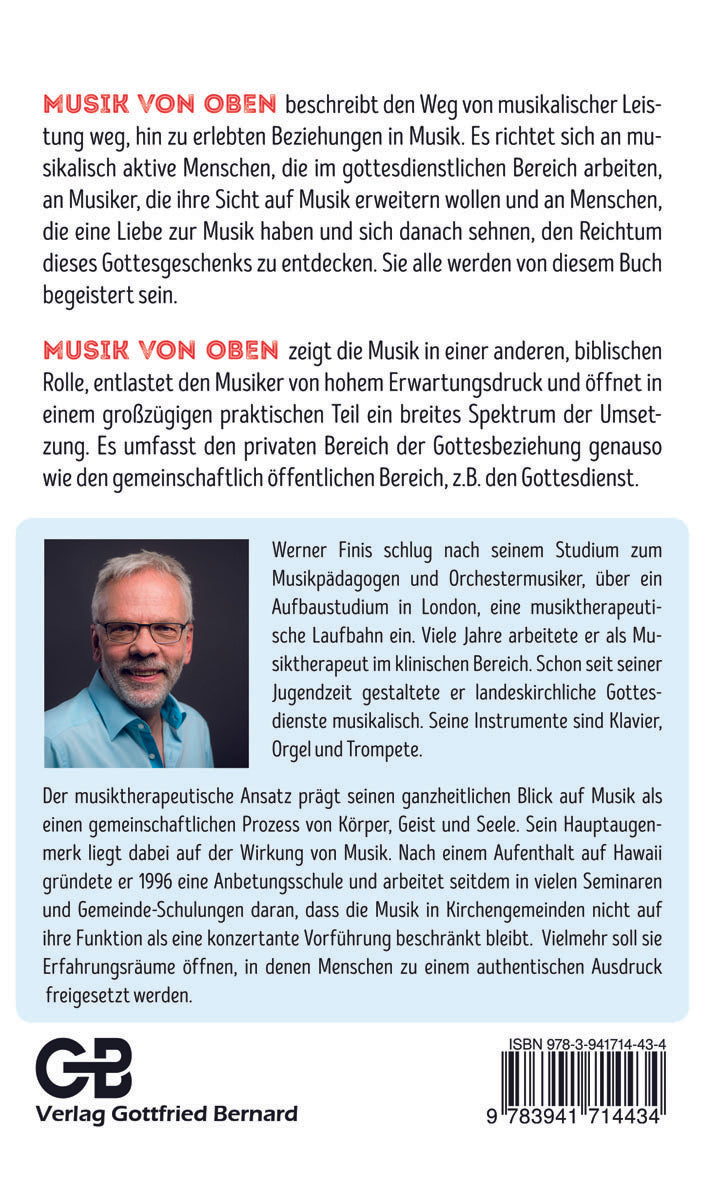"Musik von oben" beschreibt den Weg von musikalischer Leistung weg, hin zu erlebten Beziehungen in Musik. Es richtet sich an musikalisch aktive Menschen, die im gottesdienstlichen Bereich arbeiten, an Musiker, die ihre Sicht auf Musik erweitern wollen. Es richtet sich auch an Menschen, die eine Liebe zur Musik haben und sich danach sehnen, den Reichtum dieses Gottesgeschenks zu entdecken. Das Buch zeigt die Musik in einer anderen, biblischen Rolle, entlastet den Musiker von hohem Erwartungsdruck und öffnet in einem großzügigen praktischen Teil ein breites Spektrum der Umsetzung. Es umfasst den privaten Bereich der Gottesbeziehung genauso wie den gemeinschaftlich öffentlichen Bereich, z. B. den Gottesdienst.