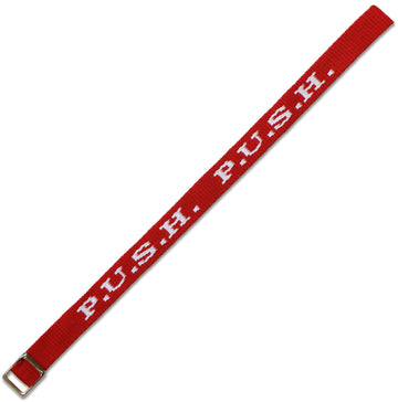 Gewebtes Armband mit Text: P.U.S.H. (Pray until something happens - Bete bis etwas passiert)