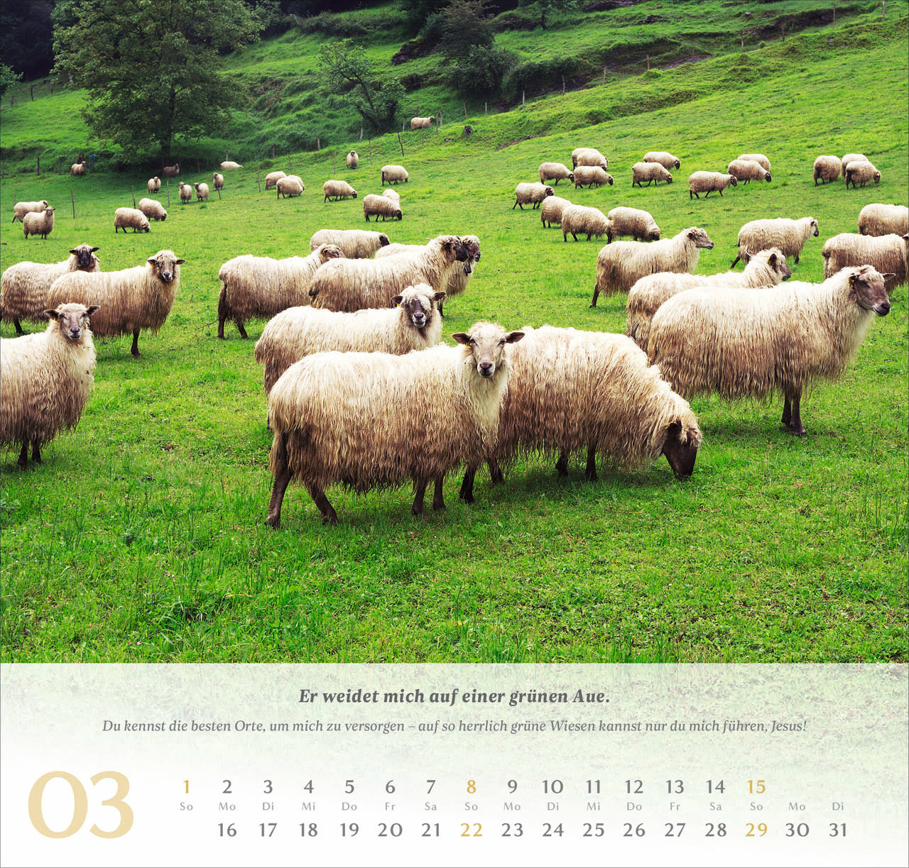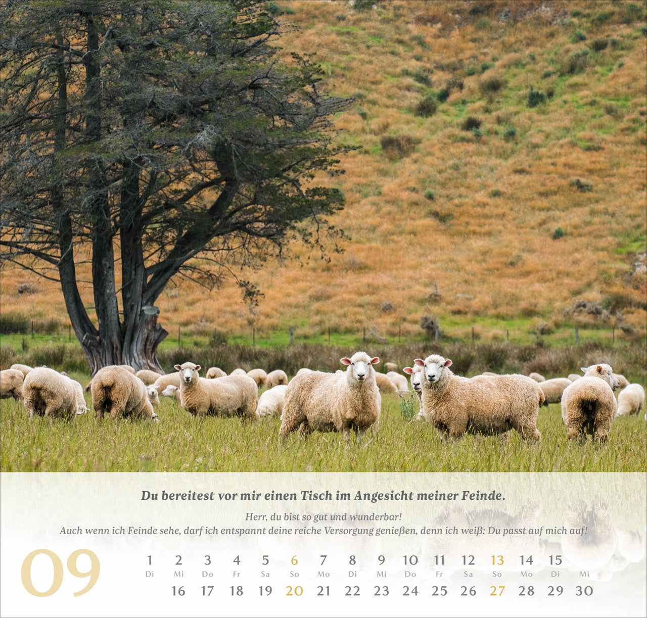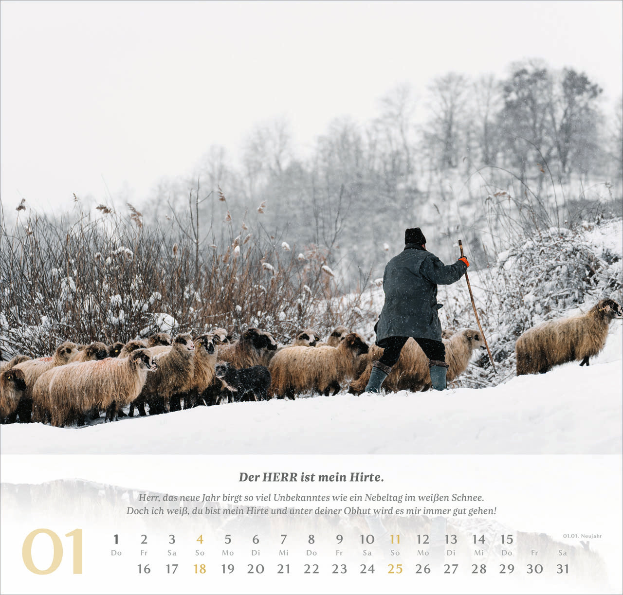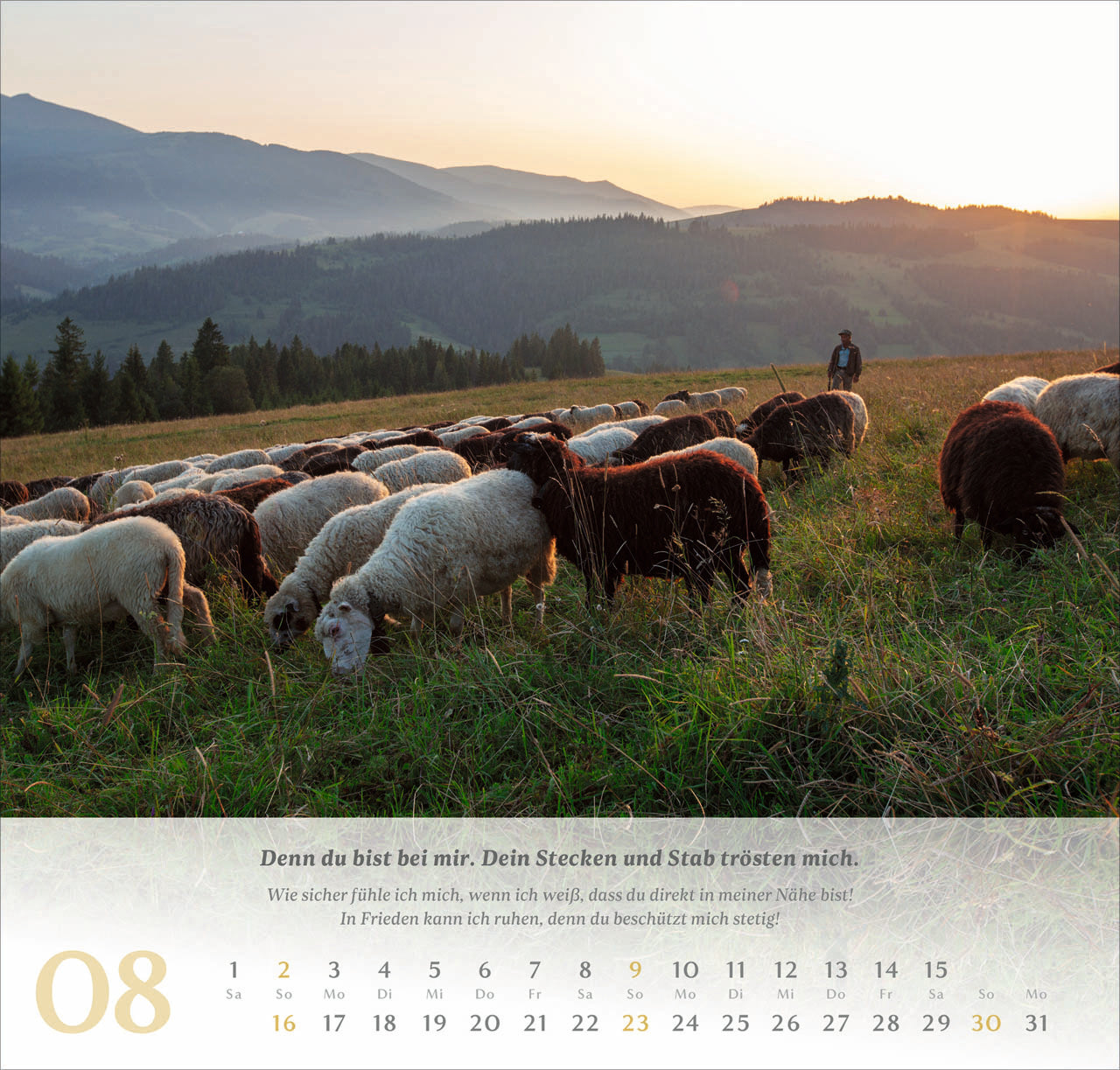 Gehen Sie mit den Gedanken dieses wunderbaren Psalms von König David durch das Jahr. Illustriert werden die Verse mit abwechslungsreichen, symbolischen Bildern, die uns den Psalm 23 näherbringen. Jeder Monat beschäftigt sich mit einem Vers des Psalms.