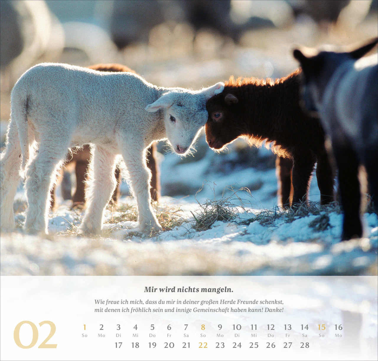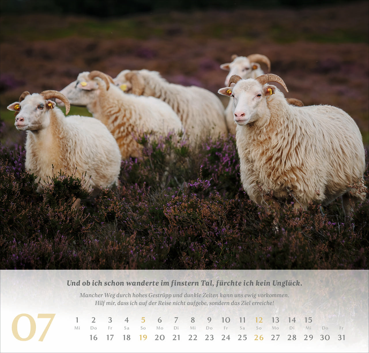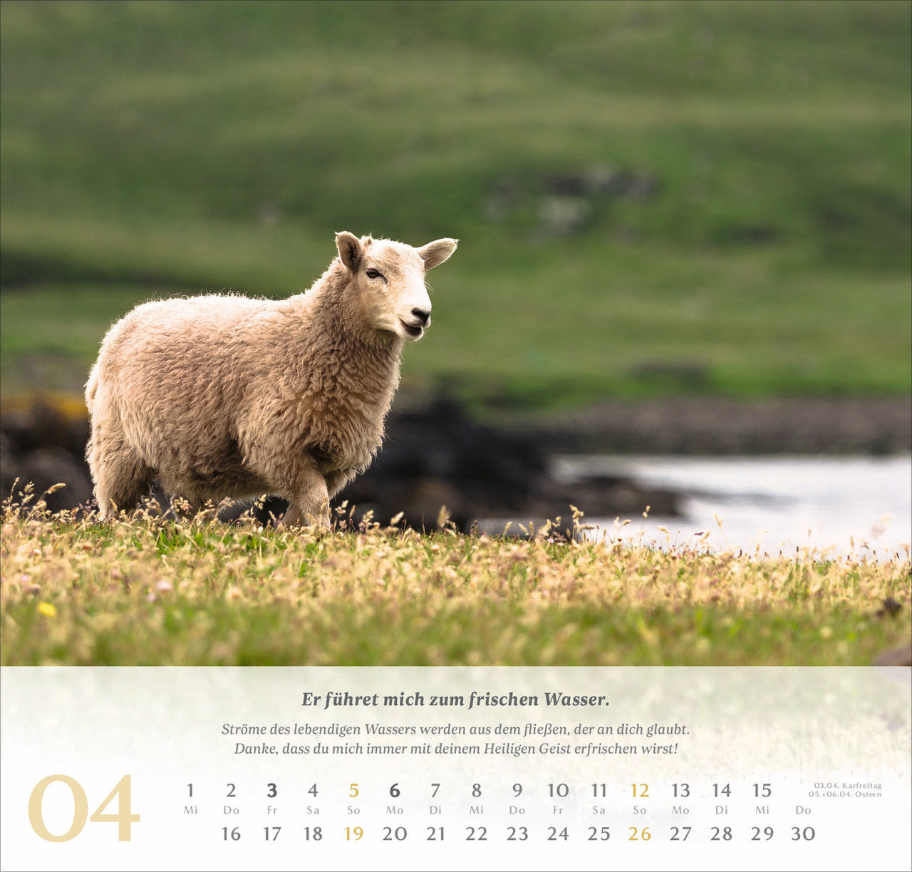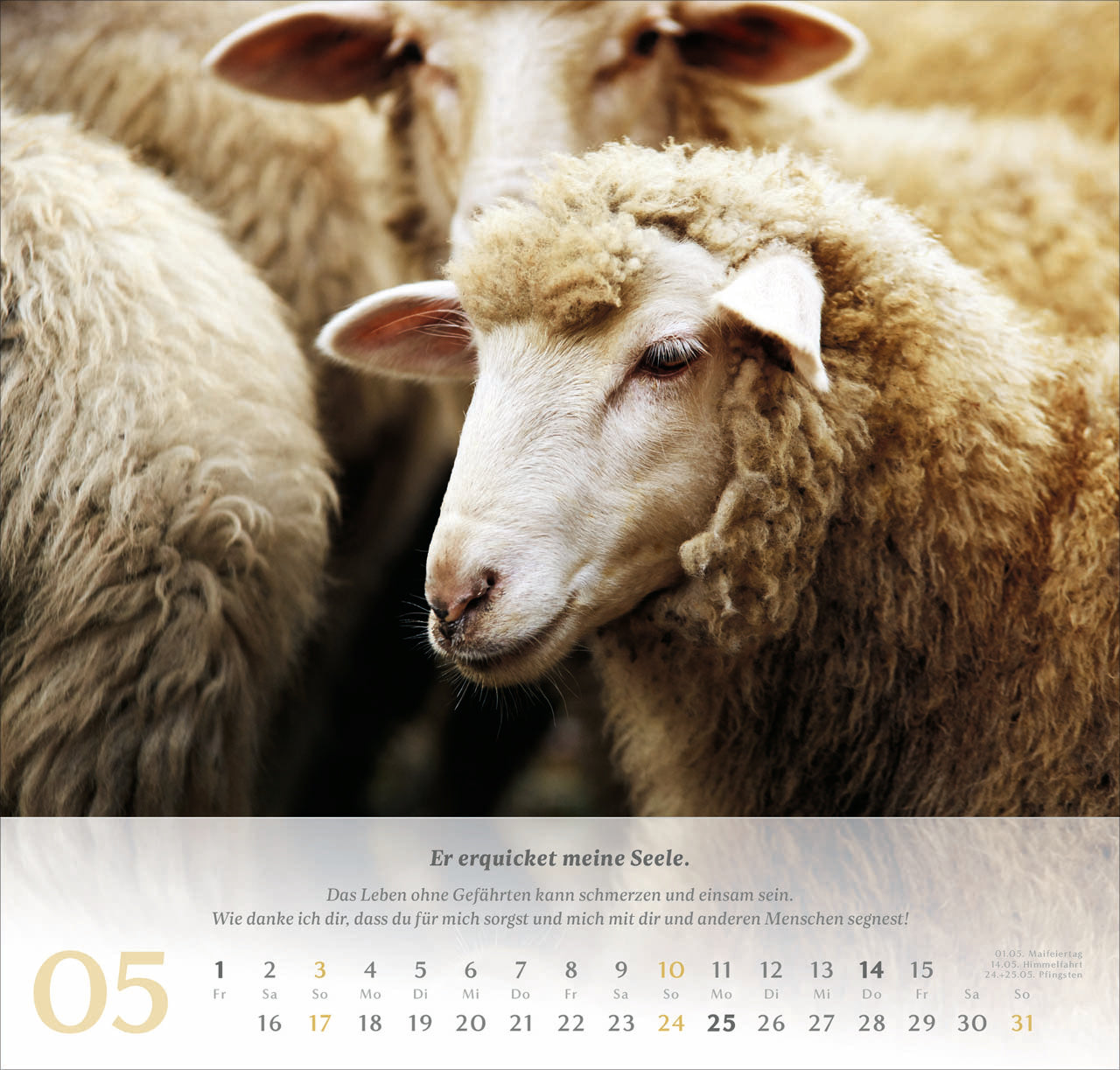 Gehen Sie mit den Gedanken dieses wunderbaren Psalms von König David durch das Jahr. Illustriert werden die Verse mit abwechslungsreichen, symbolischen Bildern, die uns den Psalm 23 näherbringen. Jeder Monat beschäftigt sich mit einem Vers des Psalms.
