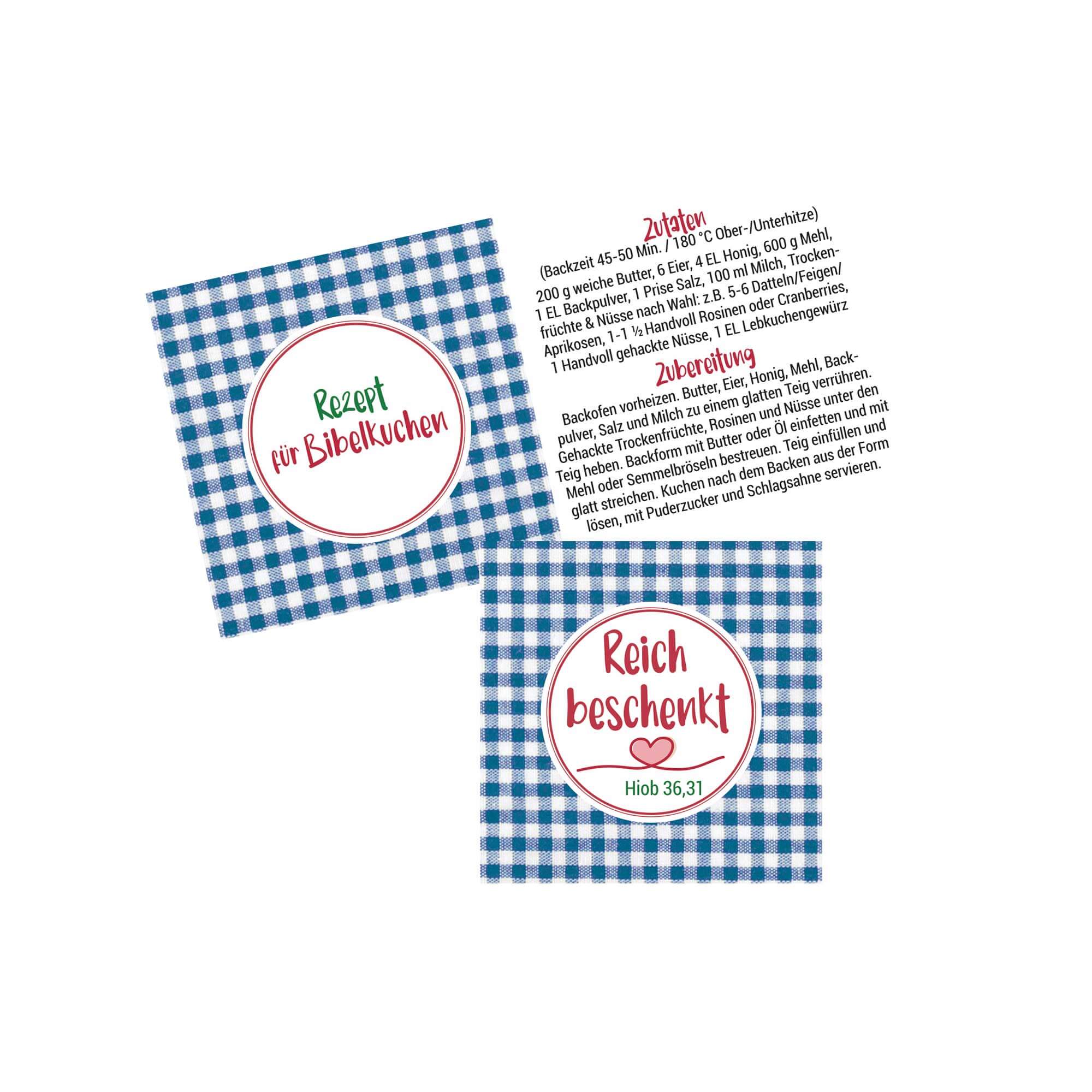 Die Rückseite des Schmuckkärtchens enthält ein Rezept für einen Bibelkuchen.