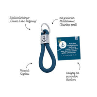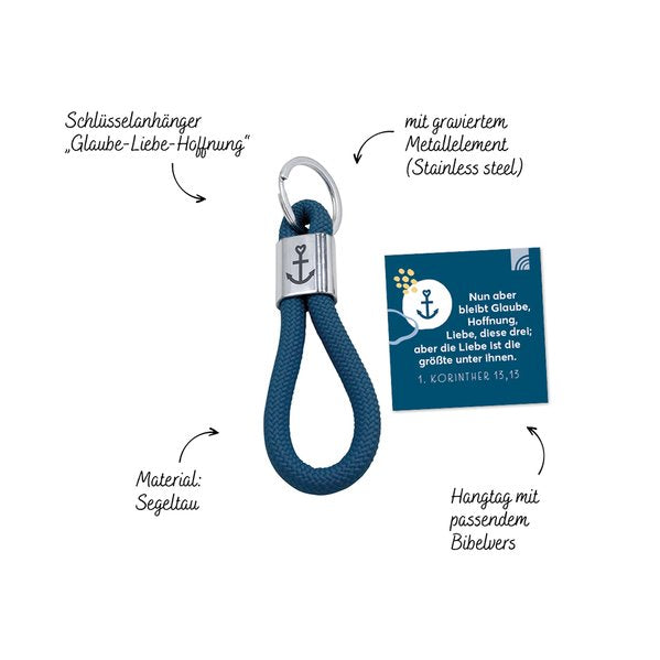 Segeltau-Anhänger mit Gravur als Geschenk oder für den eigenen Schlüsselbund; hochwertig graviert mit ermutigendem Vers auf Hangtag: Nun aber bleibt Glaube, Hoffnung, Liebe, diese drei; aber die Liebe ist die größte unter ihnen. 1. Korinther 13,13