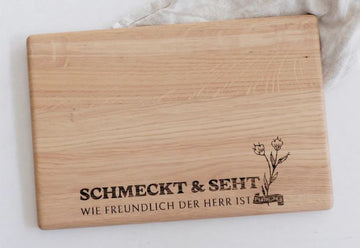 Die präzise Gravur des Bibelverses "Schmeckt und seht, wie freundlich der HERR ist - Psalm 34,9" macht es zu einem einzigartigen Küchenaccessoire oder Geschenk für besondere Anlässe. Eichenholz ist bekannt für seine Langlebigkeit und Widerstandskraft, während die Wachsschicht das Brett schützt und eine elegante, natürliche Optik verleiht. Perfekt geeignet zum Schneiden, Servieren oder als dekoratives Element.
