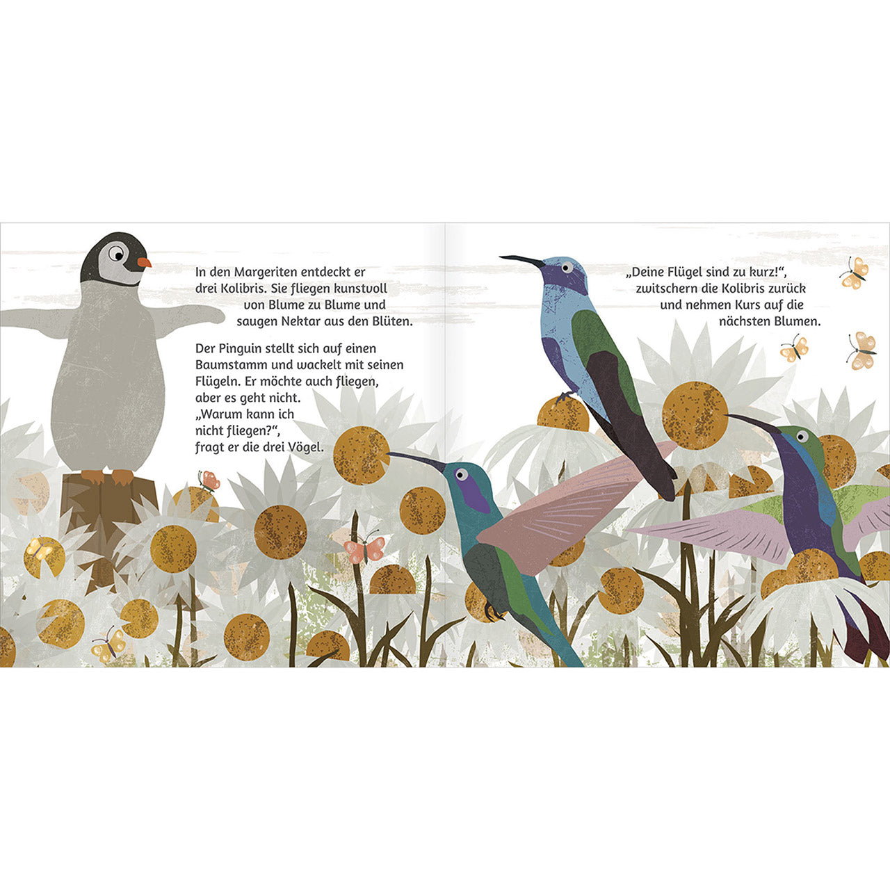 Ein kleiner Pinguin entdeckt voller Neugier die anderen Tiere seines Zoos. Dabei muss er feststellen, dass er sich mit keinem von ihnen messen kann. Traurig geht er zu seinem Schwimmbecken zurück und tut, was ihn wieder glücklich macht: Er taucht ab. Erst durch die erstaunten Gesichter der anderen Tiere, welche sich alle vor seinem Pool versammeln, wird ihm bewusst, was für ein wunderbares Talent er hat. Zufrieden erkennt er, dass es sich nicht lohnt, ständig nach den anderen zu schielen. In ihm schlummern einzigartige Fähigkeiten, die nur erkannt werden müssen.