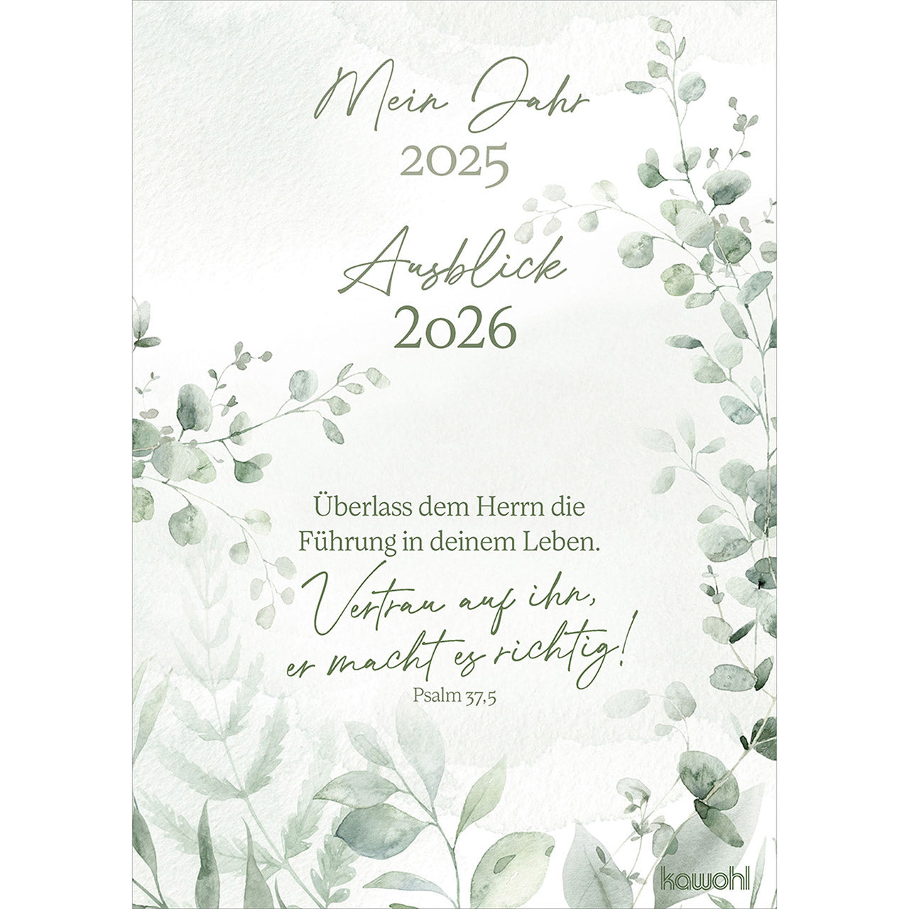 Das Ende des Jahres ist eine wunderbare Gelegenheit, innezuhalten und die Ereignisse der letzten 12 Monate zu reflektieren. Unsere stilvoll gestalteten Karten bieten auf der Rückseite Platz, um die Höhepunkte sowie die schwierigen Momente festzuhalten und Gebete für das bevorstehende Jahr zu notieren. Ein ermutigender Bibelvers auf der Vorderseite schenkt Ihnen immer wieder neue Kraft.