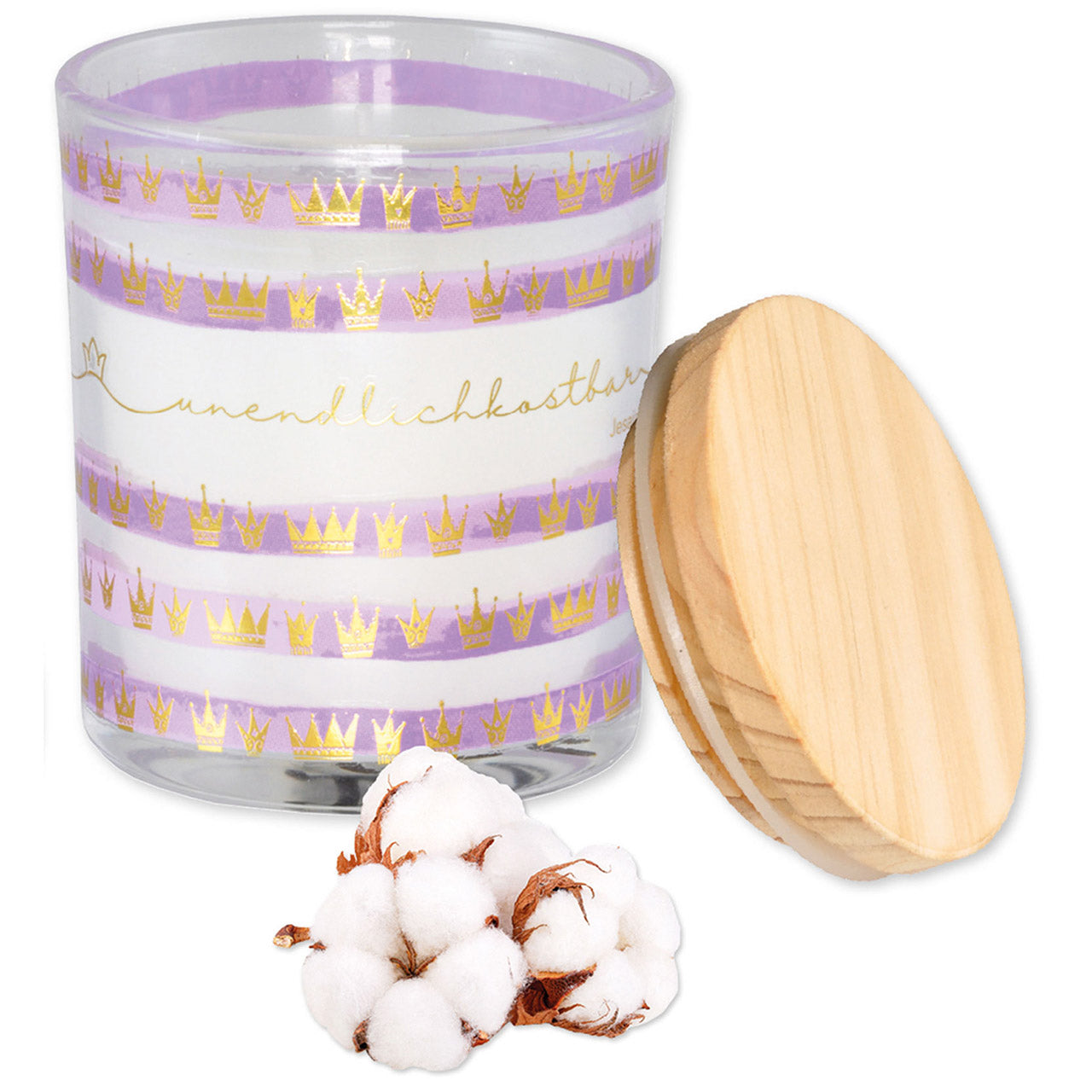 Das Glas ist mit einem Kronenmotiv bedruckt und mit einer Kerze (aus Paraffin) ausgegossen, verströmt ihren Duft, sobald der Bambus-Deckel geöffnet wird. Das Kerzenlicht umspielt das Motiv.