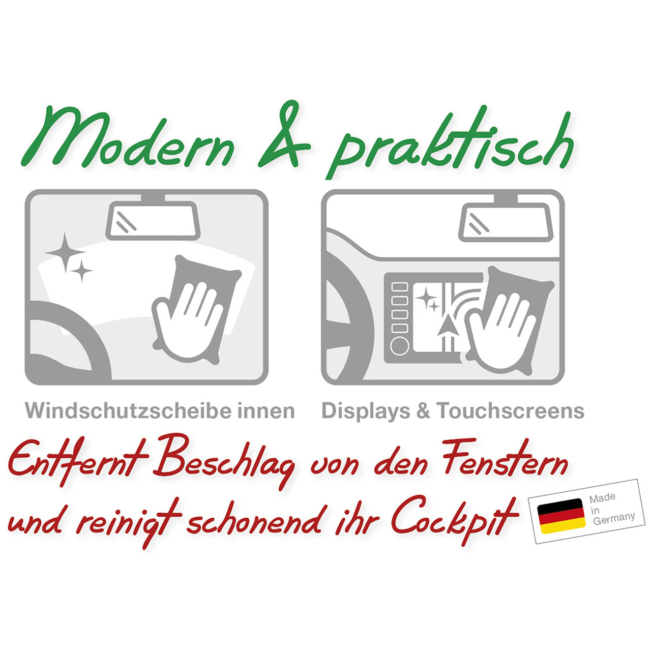 Entfernt Beschlag und Schmutz von der Windschutzscheibe, entfernt Fingerabdrücke von Navigations-Displays sowie Touchscreens, schnell und gründlich ohne Wasser und Chemie.
