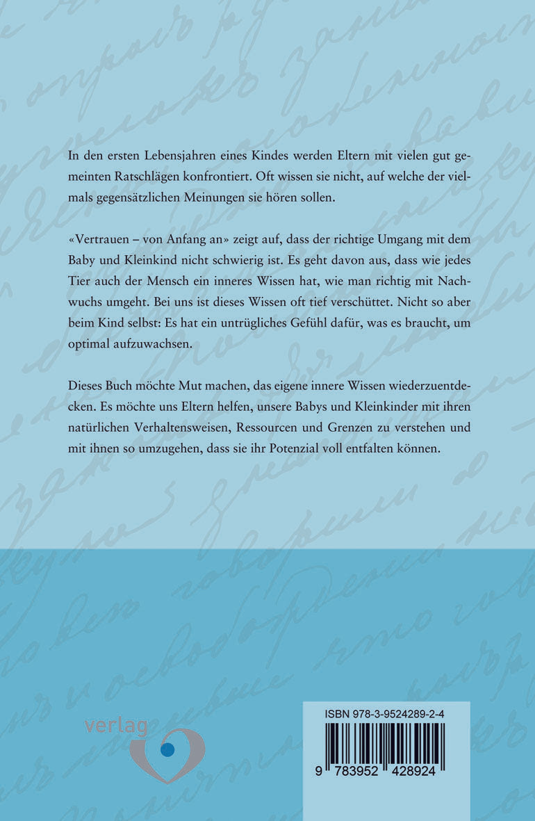 Vertrauen - von Anfang an zeigt auf, dass der richtige Umgang mit dem Baby und Kleinkind nicht schwierig ist. Es geht davon aus, dass wie jedes Tier auch der Mensch ein inneres Wissen hat, wie man richtig mit Nachwuchs umgeht. Bei uns ist dieses Wissen oft tief verschüttet. Nicht so aber beim Kind selbst: Es hat ein untrügliches Gefühl dafür, was es braucht, um optimal aufzuwachsen.