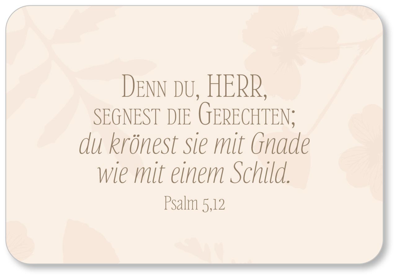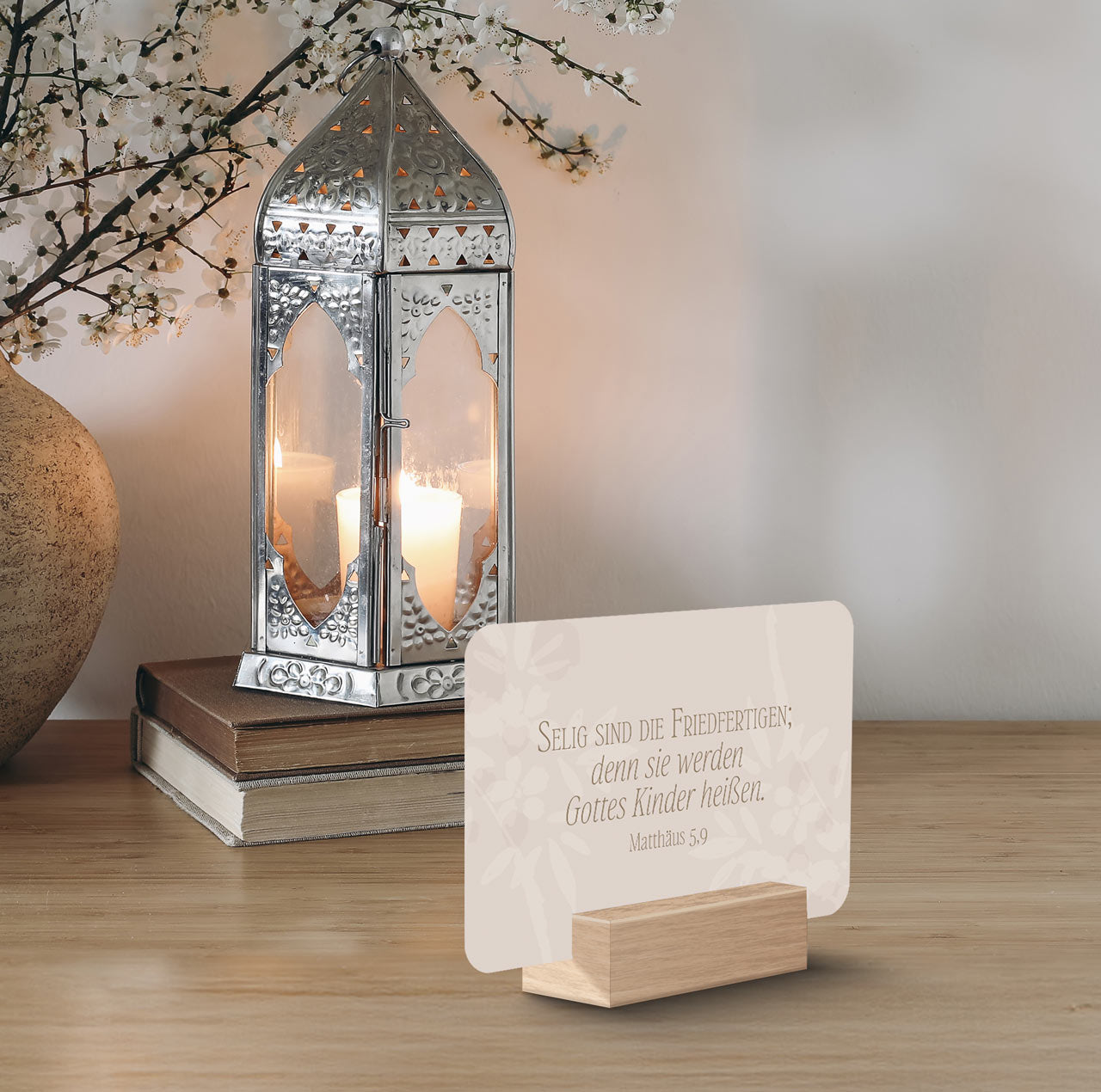 Die Boxen eignen sich als ermutigendes Geschenk oder einfach als kleine Aufmerksamkeit. Der Holzaufsteller aus edlem Material stellt sicher, dass der ausgewählte Bibelvers selbst auf dem kleinsten Tisch schön zur Geltung kommt. Die 30 Karten mit abgerundeten Ecken liegen angenehm in der Hand.