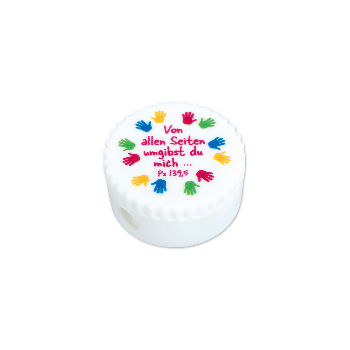 Anspitzer inkl. Auffangbehälter, bedruckt mit buntem Hände-Motiv und Text: