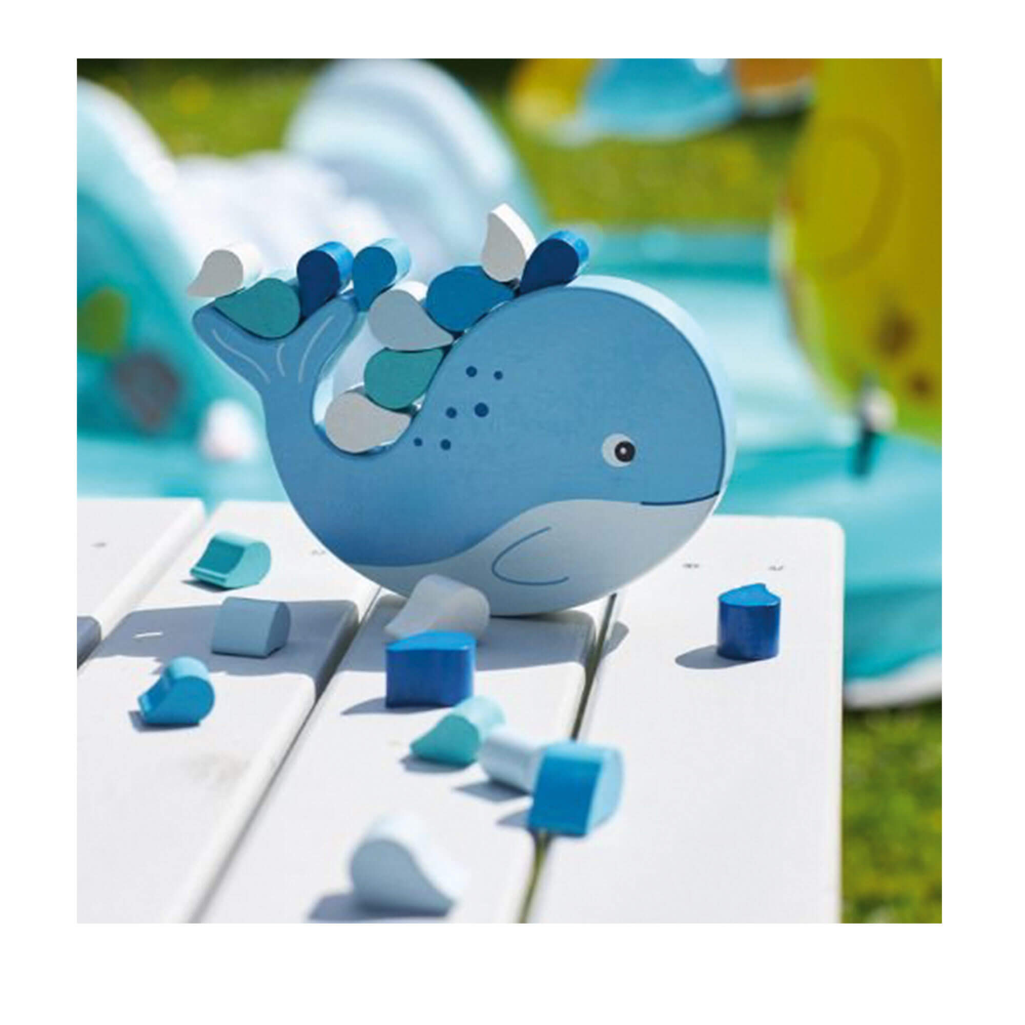 Prustend stößt der Wal eine große Fontäne aus weißen und verschieden blauen Wassertropfen aus. Ziel des Spiels ist es, all diese Tropfen auf den Walrücken und die Schwanzflosse zu stapeln, ohne dass der Wal aus dem Gleichgewicht gerät und die Tropfen herunterfallen. Dafür braucht es viel Fingerspitzengefühl und ein wenig taktisches Geschick. Spielerisch werden nebenbei Motorik, Koordination und Konzentration trainiert und gefördert.