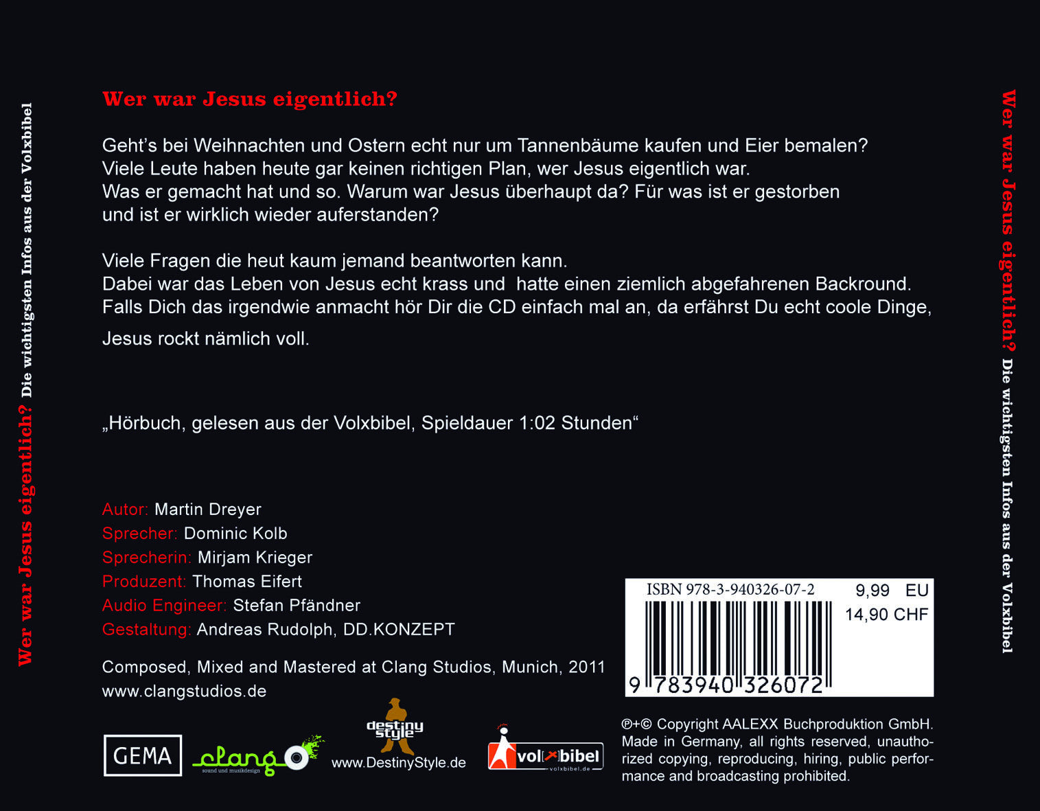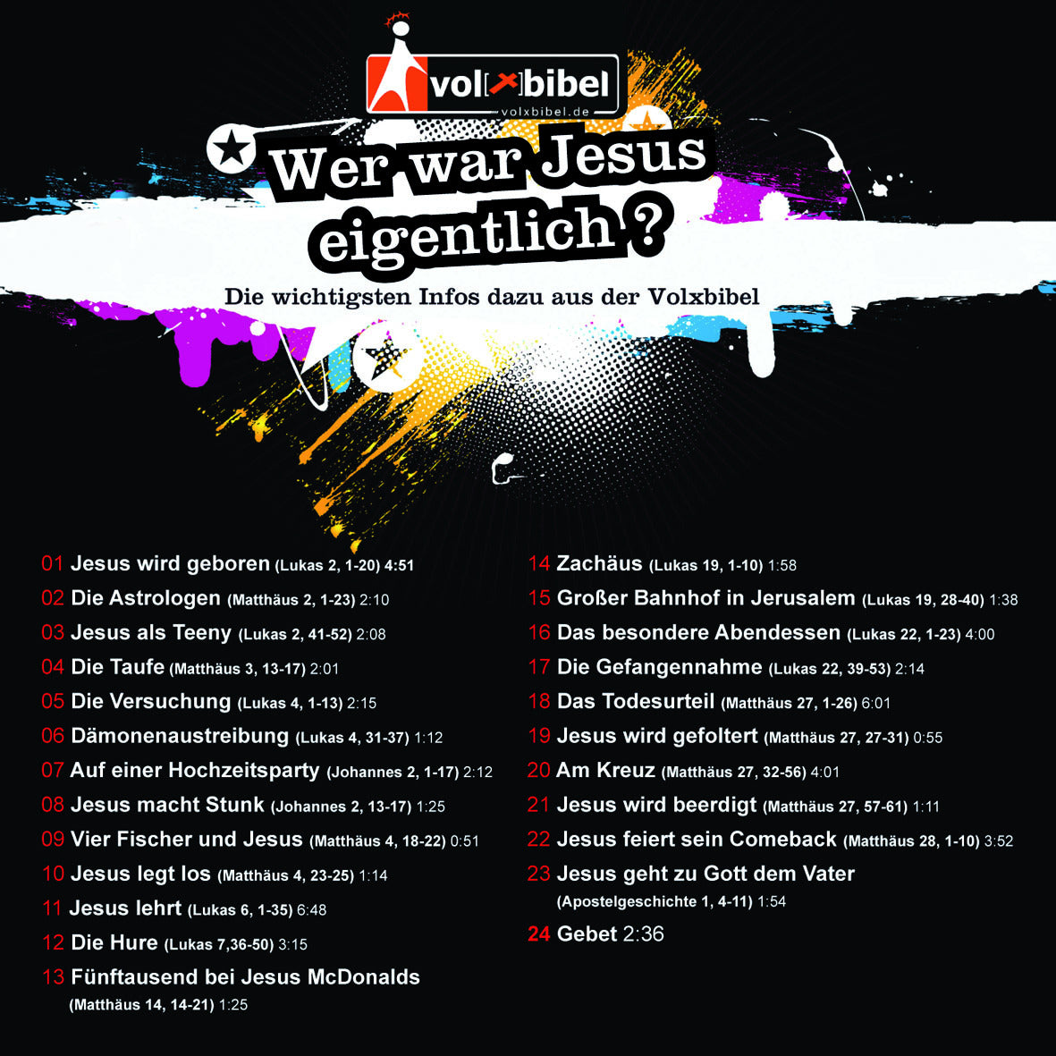 Gehts bei Weihnachten und Ostern echt nur um Tannenbäume kaufen und Eier bemalen? Viele Leute haben heute gar keinen richtigen Plan, wer Jesus eigentlich war. Was er gemacht hat und so. Warum war Jesus überhaupt da? Für was ist er gestorben und ist er wirklich wieder auferstanden? Viele Fragen die heut kaum jemand beantworten kann. Dabei war das Leben von Jesus echt krass und hatte einen ziemlich abgefahrenen Background. Falls Dich das irgendwie anmacht hör Dir die CD einfach mal an, da erfährst Du echt coole Dinge, Jesus rockt nämlich voll. - Hörbuch, gelesen aus der Volxbibel.