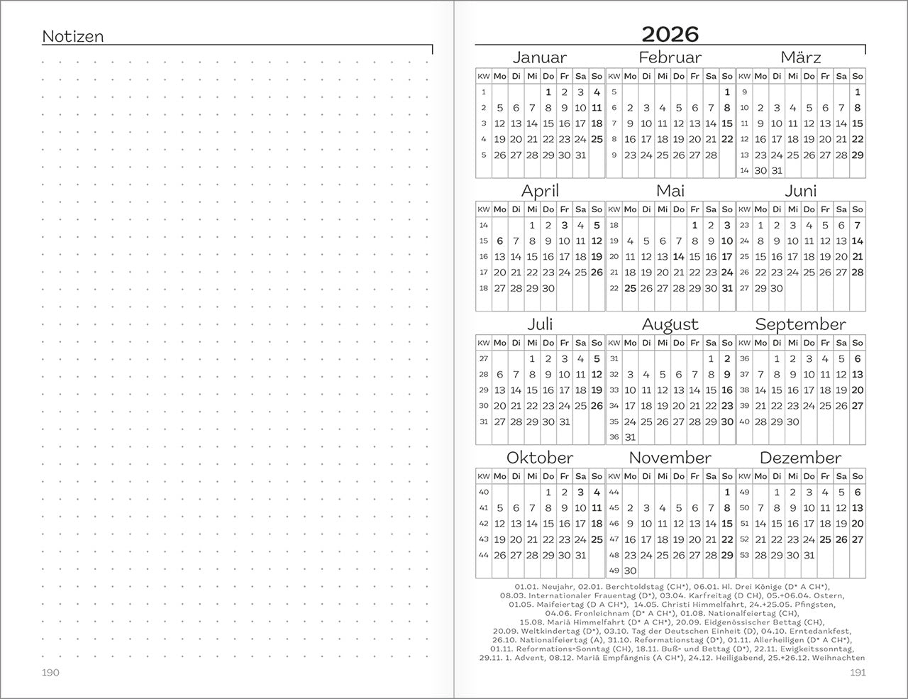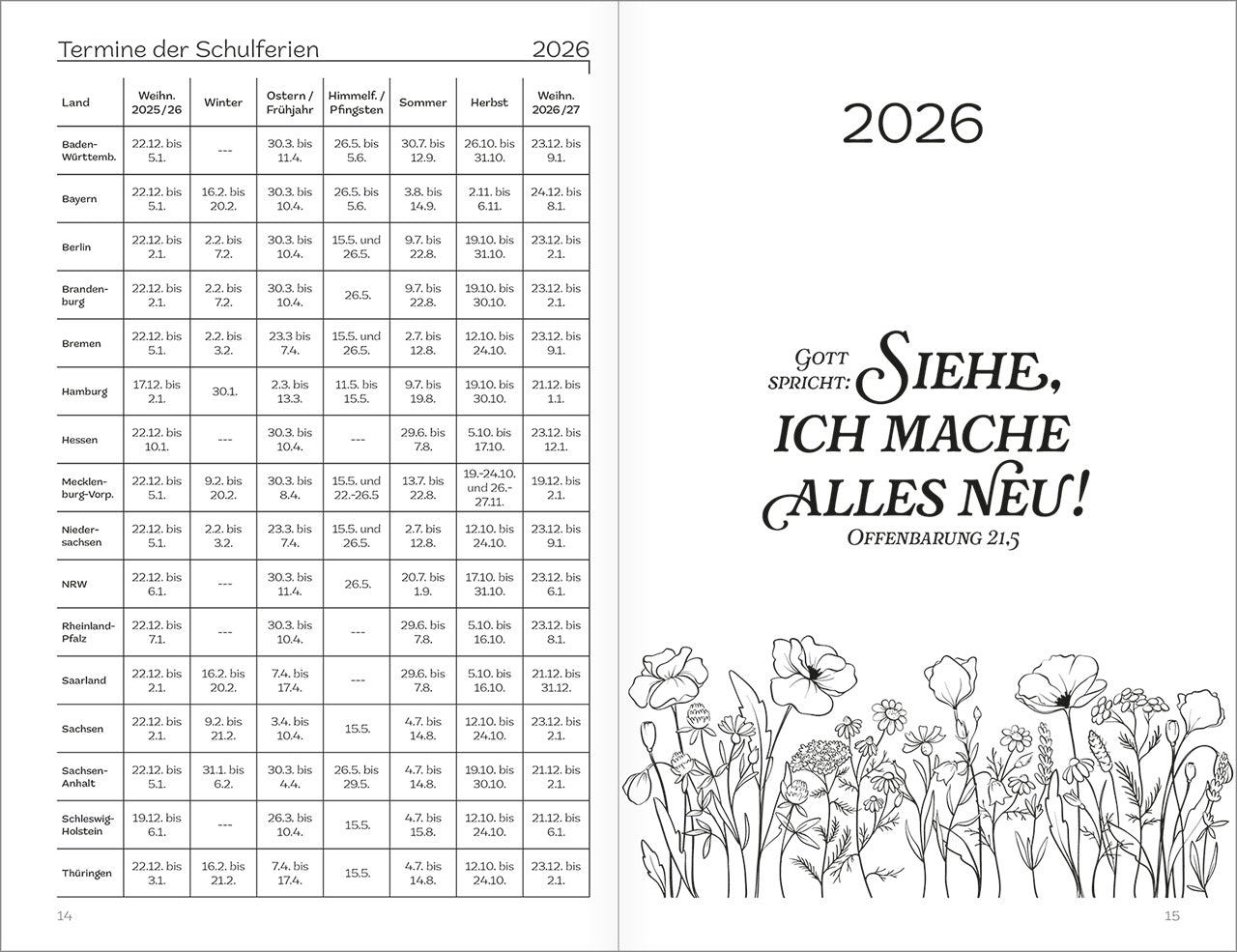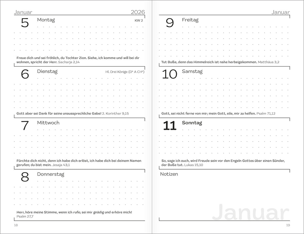 Mit ausgelosten Bibelversen für jeden Tag und viel Platz für Eintragungen.