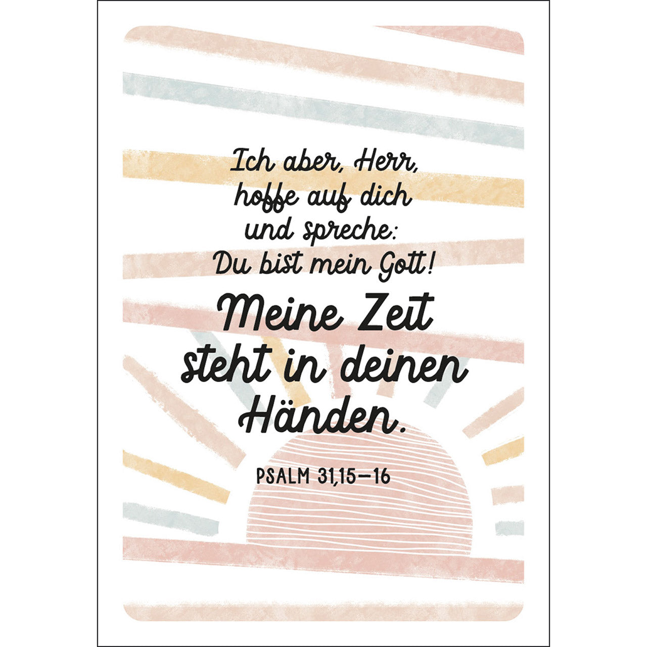 Mindestens 52 mal ermutigen diese Karten - gestaltet von Catharina Neideck - durch Bibelverse, neuen Mut zu finden, Kraft zu tanken und sich bewusst darüber zu werden, wie Gott uns liebt und trägt. Ein Bibelvers spricht jeweils direkt in die Seele. Und auf der Rückseite lädt ein Gebet ein, auf Gottes Wort zu antworten und die Ermutigung zu verinnerlichen.