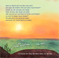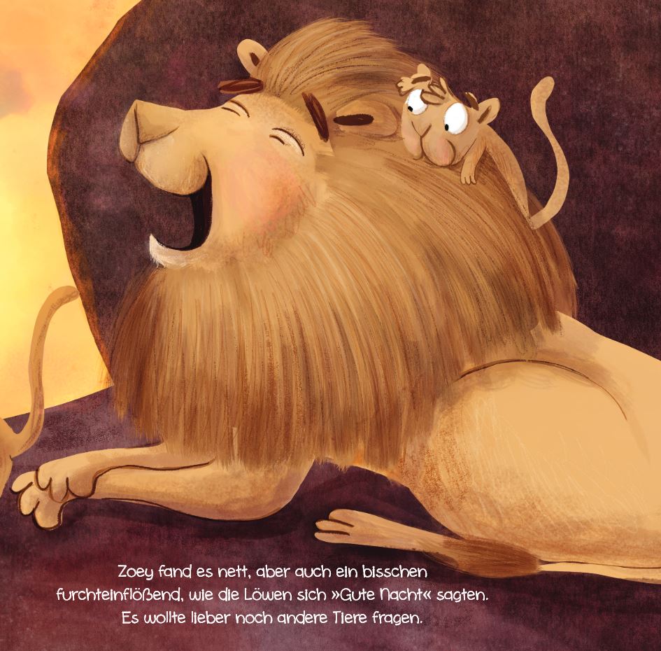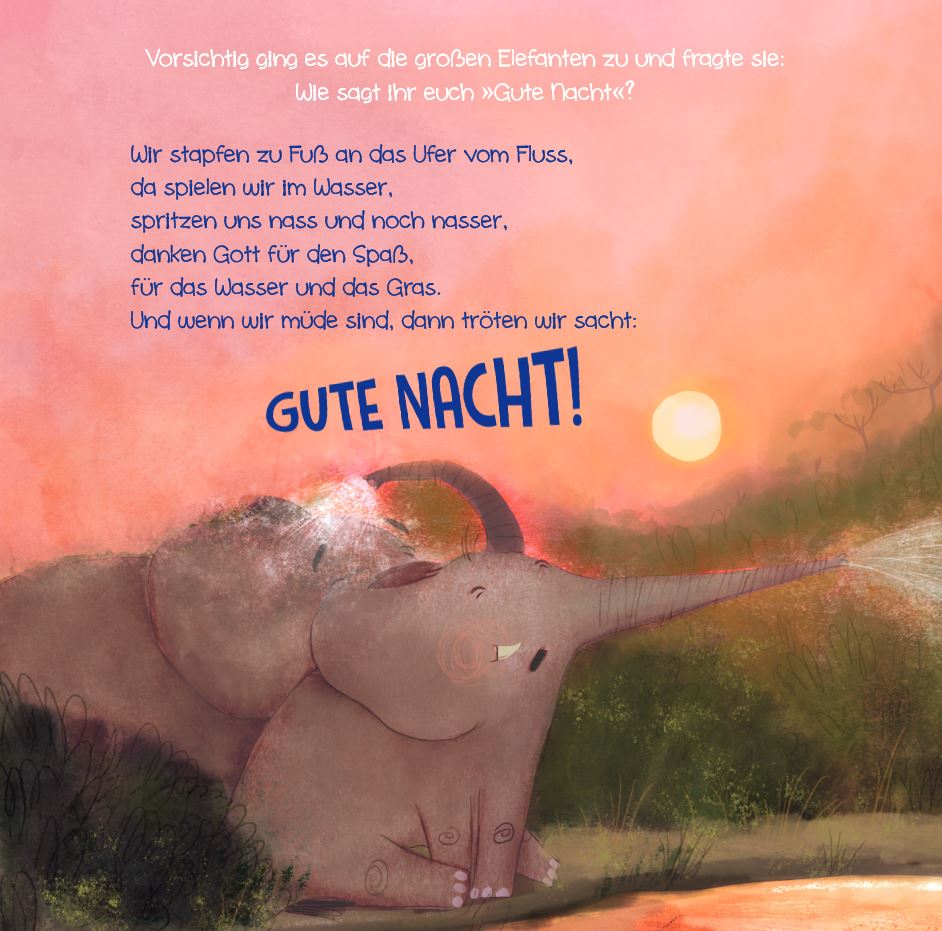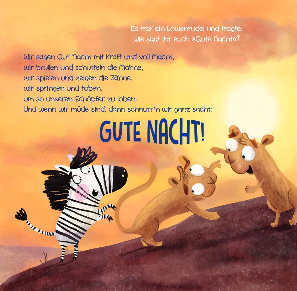 Wie wünscht man sich am besten eine "Gute Nacht!" - das fragt sich das Zebra Zoey. Es macht sich auf den Weg, von den anderen Tieren zu erfahren, auf welche Weise sie den Tag beenden. Bei den Löwen und den Warzenschweinen, bei den Elefanten und den Affen erfährt sie, auf wie laute und leise, lustige und immer liebevolle Weise man den Tag beschließen und Gott für das Erlebte danken kann.
