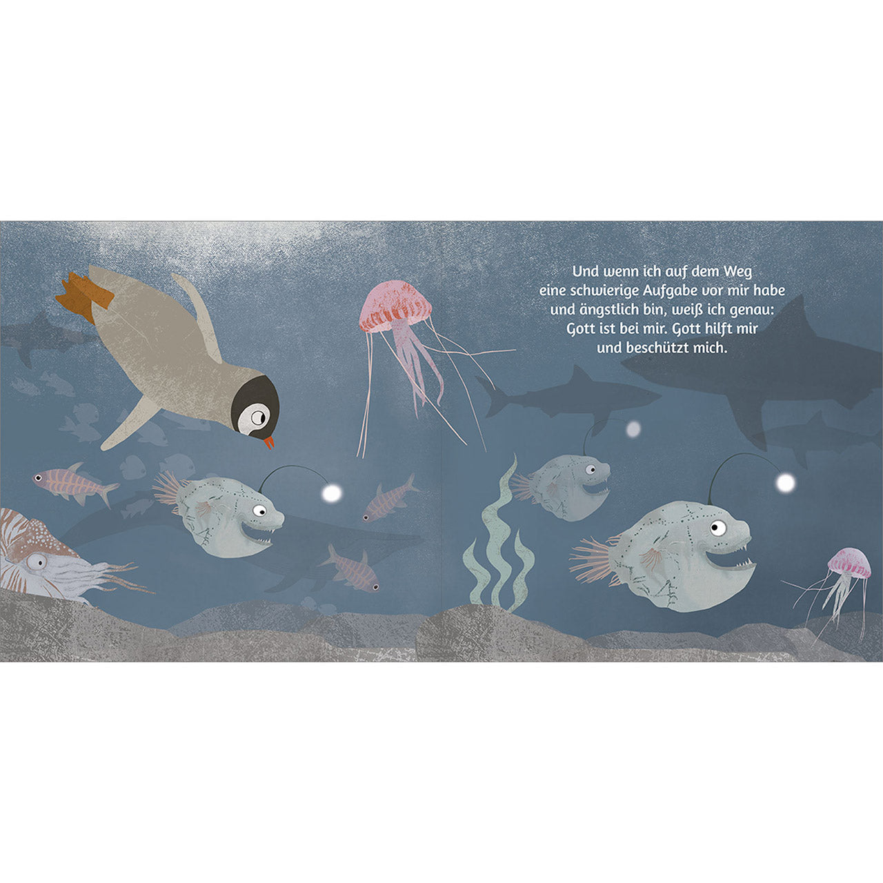Im vierten Band aus der beliebten Kinderbuch-Reihe von Anja Günther entdeckt der kleine Pinguin die wunderbare Welt des Psalm 23. Auf seine ganz eigene Weise nimmt er die Kleinsten mit auf seinem Weg durch Höhen und Tiefen eines Pinguin-Lebens. Phantasievoll, mit viel Humor und Liebe zum Detail werden dabei die Zusagen aus dem beliebtesten Psalm vor Augen geführt und in kindgerechter Sprache erzählt. Ob entspannt auf einer Wiese, im tropischen Regenschauer oder in tiefer, dunkler See zwischen bedrohlichen Fischen - der Pinguin weiß sich begleitet und bewahrt.