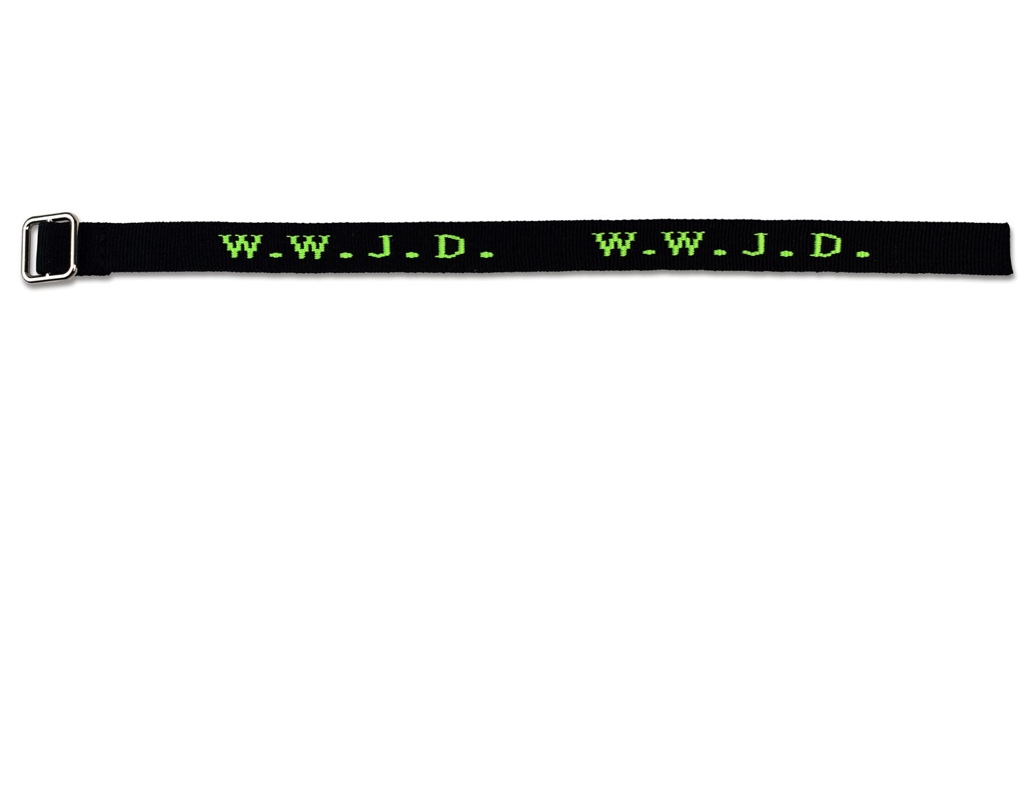 Gewebte, schwarze Armbänder mit Metallschnalle in bewährter Qualität, mit Text "W.W.J.D." in verschiedenen Neonfarben, Länge ca. 25 cm